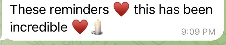 “I am still in awe from our 1:1 session earlier this month. The loving care, space you held and inquiry you took me through were incredible. What you were able to sense, validate and help me move through in such a short period of time is nothing short of amazing. I feel so lucky that I was able to have this session with you in person and to experience your gifts first hand!