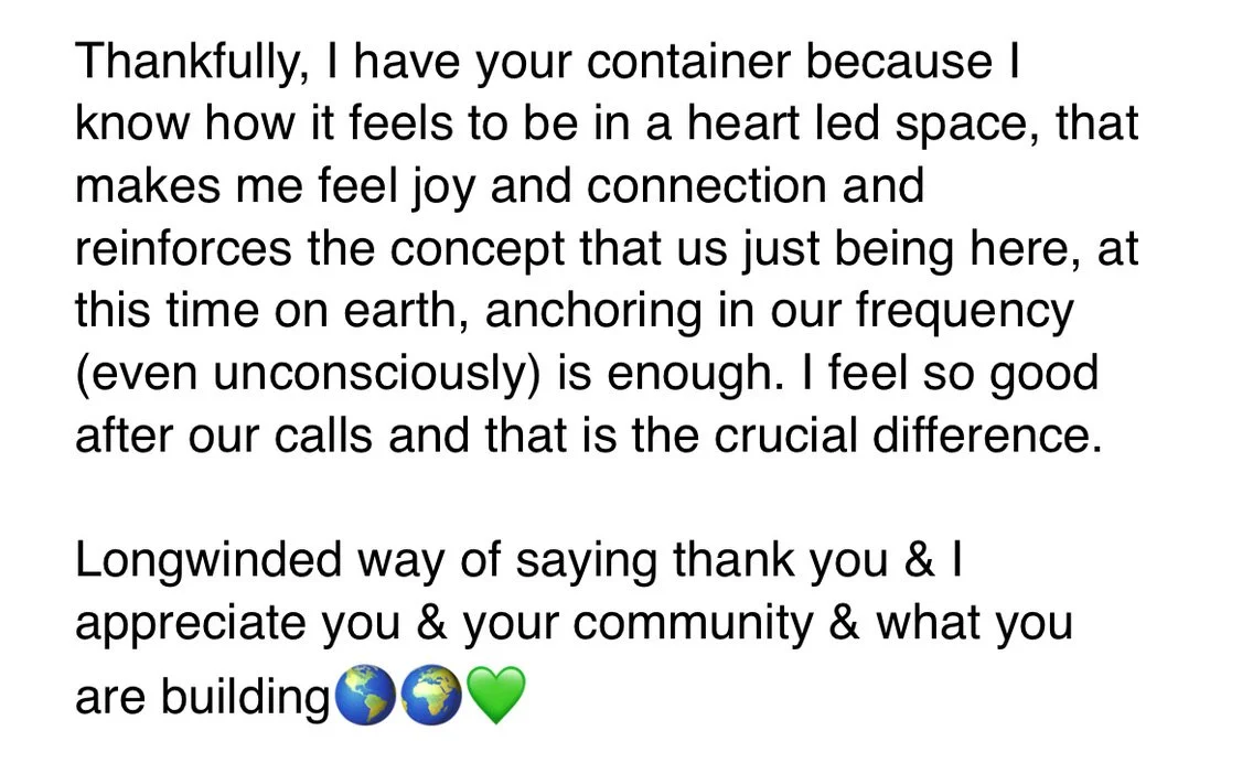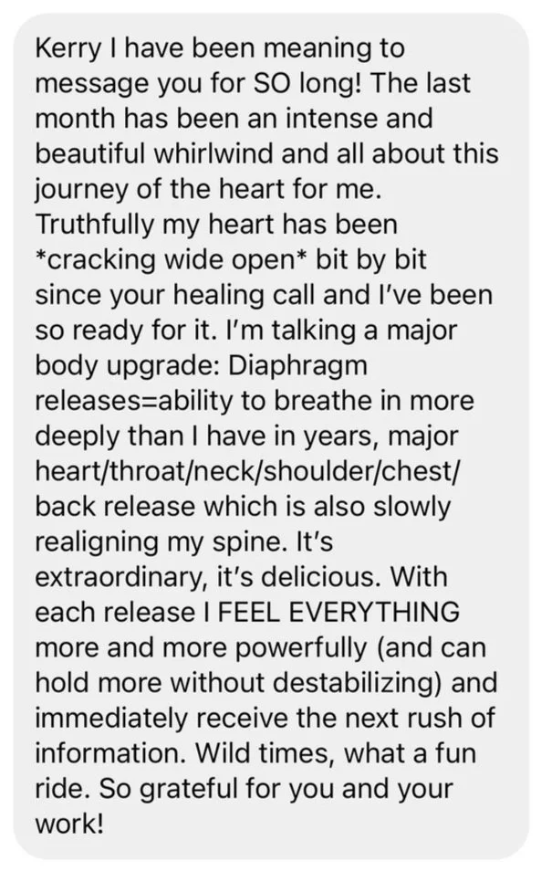 “Truthfully my heart has been *cracking wide open* bit by bit since your healing call and I’ve been so ready for it. I’m talking a major body upgrade: diaphragm releases = ability to breathe in more deeply than i have in years, major heart/throat/neck/shoulder/chest/back release which is also slowly realigning my spine. It’s extraordinary, it’s delicious. With each release I FEEL EVERYTHING more and more powerfully (and can hold more without destabilizing) and immediately receive the next rush of information. Wild times, what a fun ride. So grateful for you and your work!”